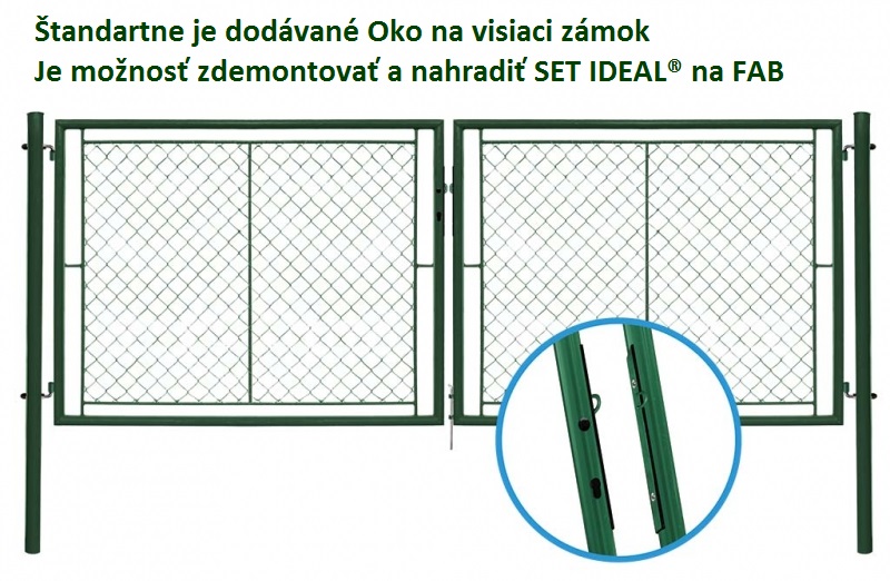 Záhradná dvojkrídlová brána YDEAL s výplňou pleteného pletiva IDEAL 50. Úprava je zinok + pvc vo farbe RAL6005 zelená. Brána je výšky 175cm a šírky 360,5cm (stred a stred stĺpika). Priechod je 353cm. Brána má rám z guľatých profilov (uzatvorený). Balenie obsahuje: 2x stĺpik Ø76mm 240cm, oko na visiaci zámok, nastavovacie pánty, doraz a dorazový kolík - doraz. Možnosť dokúpiť FAB set (kľučka, FAB vložka +2x kľúč, zámok, štítky).