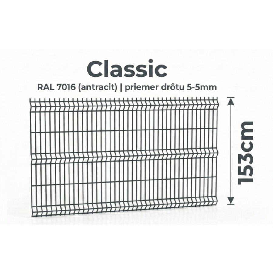 Plotový panel Classic 3D má rozmery 153 cm x 250 cm, drôt 5 mm a oko 45 x 200 mm. Je celo-pozinkovaný a poplastovaný v odtieni RAL 7016 pre dlhú životnosť.