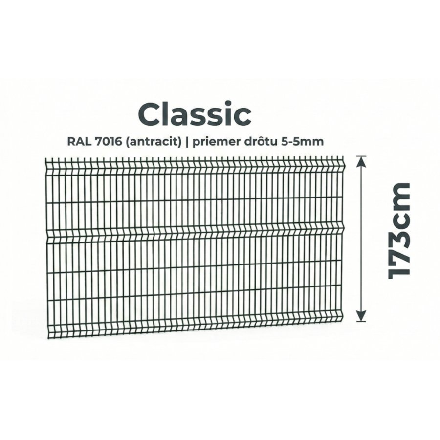 Plotový panel Classic 3D má rozmery 173 cm x 250 cm, drôt 5 mm a oko 45 x 200 mm. Je celo-pozinkovaný a poplastovaný v odtieni RAL 7016 pre dlhú životnosť.