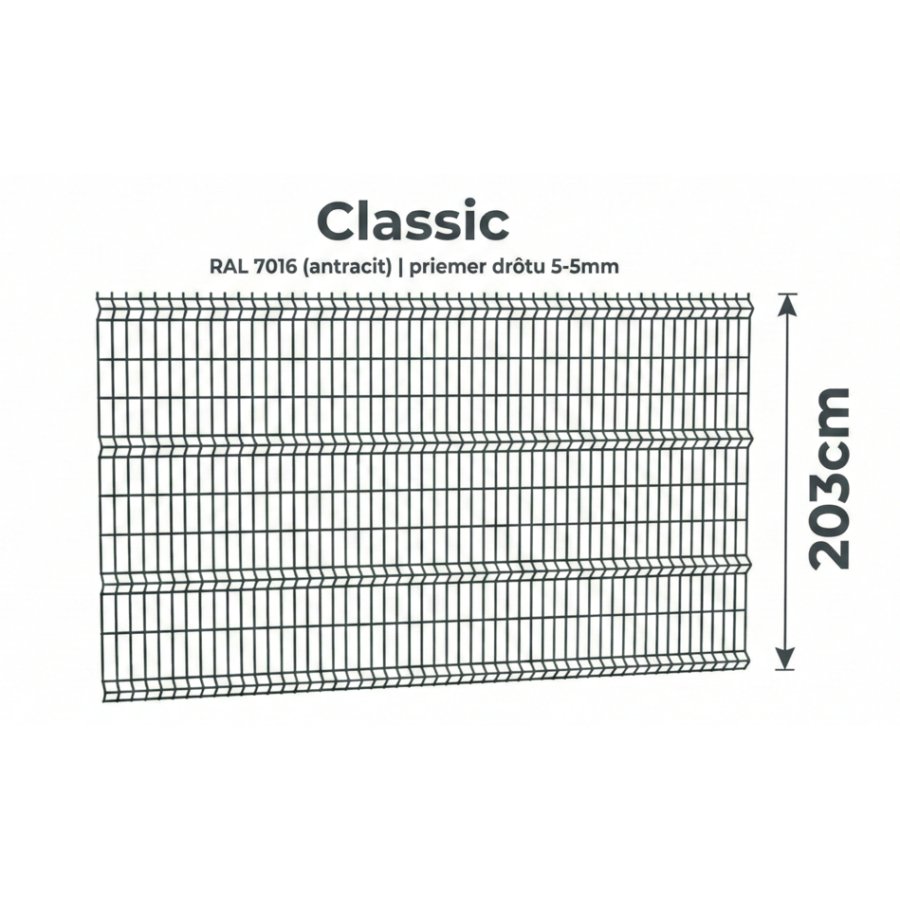 Plotový panel Classic 3D má rozmery 203 cm x 250 cm, drôt 5 mm a oko 45 x 200 mm. Je celo-pozinkovaný a poplastovaný v odtieni RAL 7016 pre dlhú životnosť.