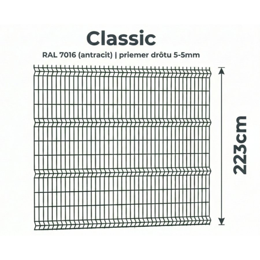 Plotový panel Classic 3D má rozmery 223cmx250 cm, drôt 5mm a oko 45x200 mm. Je celo-pozinkovaný a poplastovaný v odtieni RAL 7016 pre dlhú životnosť.