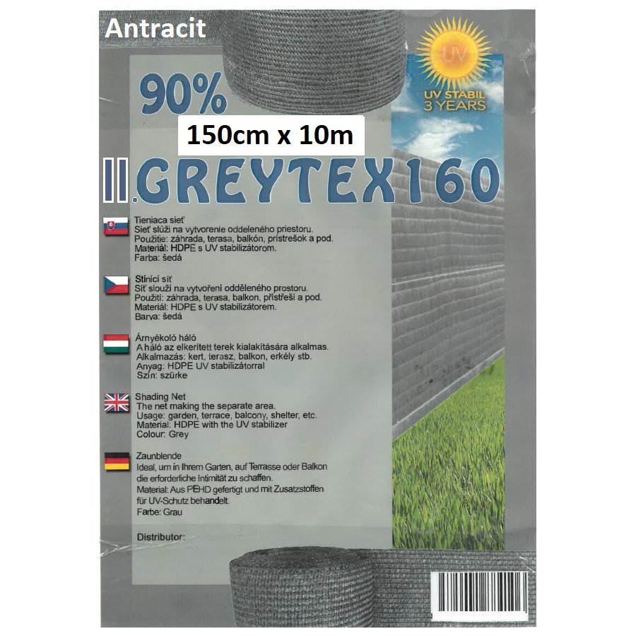 Antracit tieniaca sieť GREYTEX II. výšky 150cm zníži priehľadnosť Vášho oplotenia o 90% a zaistí tak súkromie Sieť je vyrobená z PVC vlákien s UV ochranou a má spevnený okraj. Balenie je v dĺžke 10 metrov.