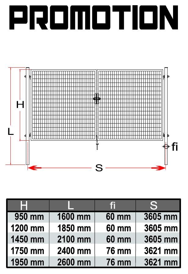 Záhradná dvojkrídlová brána Promotion s výplňou zváraného pletiva s okami 50x100mm a priemerom drôtu 3,5mm. Úprava je zinok + pvc vo farbe RAL7016 antracit. Brána je výšky 95cm a šírky 360,5cm (stred a stred stĺpika). Brána má rám z guľatých profilov (uzatvorený). Balenie obsahuje: 2x stĺpik Ø60mm 160cm, oko na visiaci zámok, nastavovacie pánty, dorazový kolík - doraz. Možnosť dokúpiť FAB set (kľučka, FAB vložka +2x kľúč), zámok, štítky).