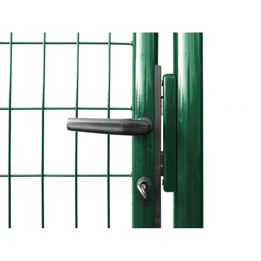 Záhradná jednokrídlová bránka PROMOTION s výplňou zváraného pletiva s okami 50x100mm a priemerom drôtu 3,5mm. Úprava je zinok + pvc vo farbe RAL6005 zelená. Bránka je výšky 195cm a šírky 108,5cm (stred a stred stĺpika). Bránka má rám z guľatých profilov (uzatvorený). Balenie obsahuje: 2x stĺpik Ø60mm 250cm, pánty, dózický zámok (jednoduchá zámena za FAB), kovový doraz a plastovú kľučku. Bránku je možné použiť ako ľavé alebo pravé uzatváranie (otváranie dnu i von).