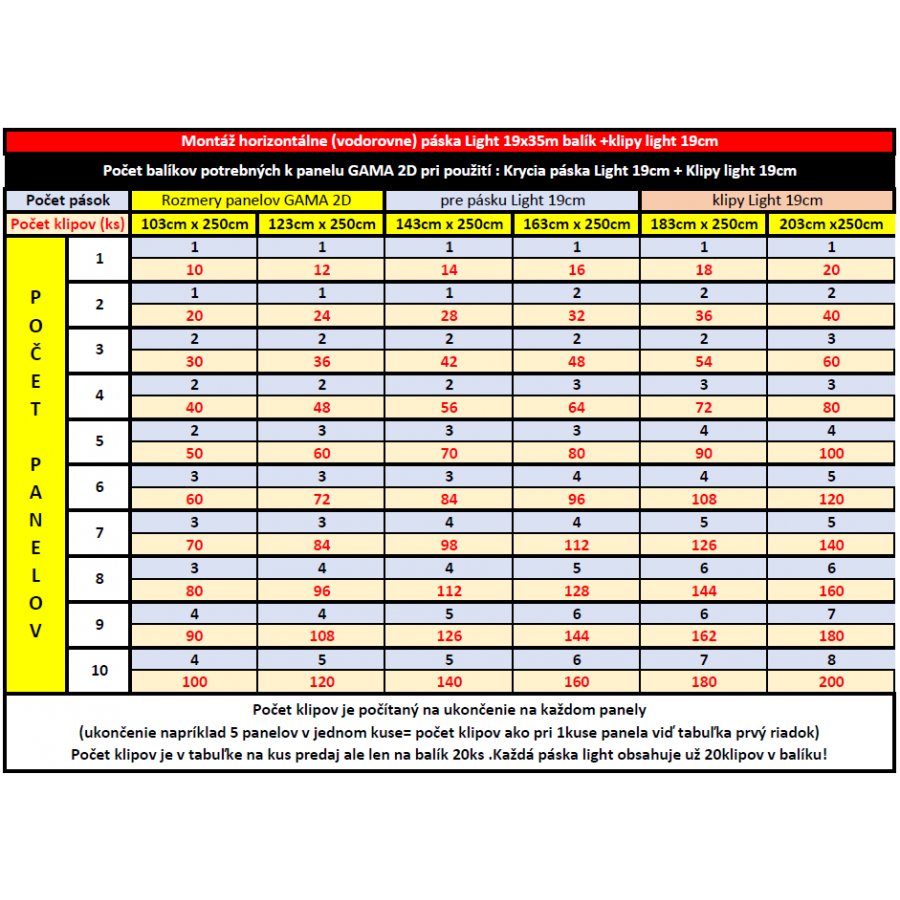 Tabuľka s počtom pások pre panel GAMA 2D