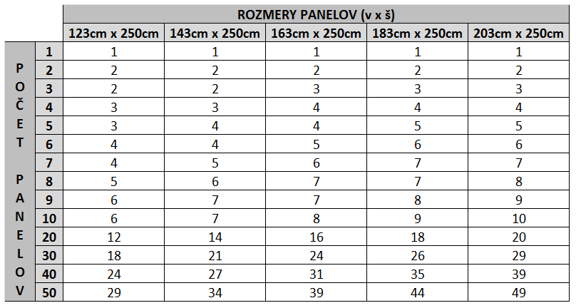 Počet balíkov potrebných pre prekrytie 2D panelov v tabuľke: