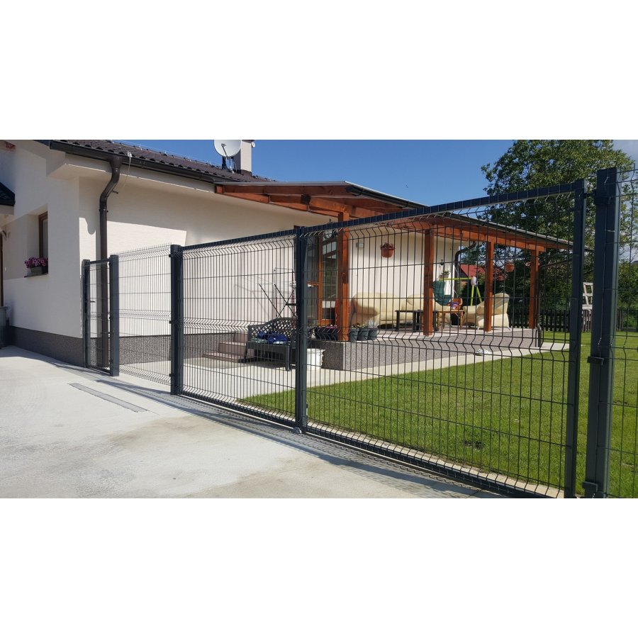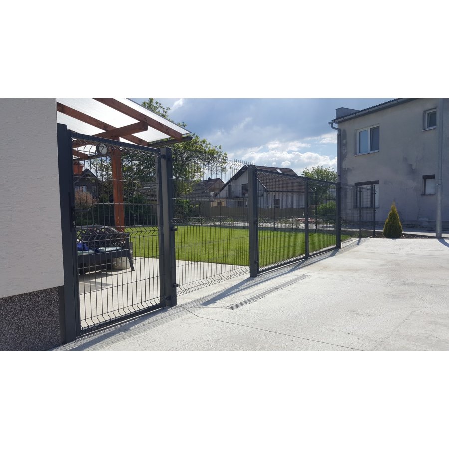 Dvojkrídlová žiarovo pozinkovaná + PVC RAL 7016 antracit brána MODEST s pevnou konštrukciou, vhodná k plotovým panelom. Výška brány 123cm a šírka 308cm (stred a stred stĺpika). Rám je s joklových profilov 40x40 (uzavretý). Výplň brány je panel CLASSIC 3D s hrúbkou drôtu 5mm. Súčasťou je: 2x stĺpik 80x80 výšky 180cm, kľučka, FAB vložka + 3x kľúč, zámok, nastavovacie pánty, doraz, stredový kolík, zástrč a štítky. Brána sa vyznačuje vysokou kvalitou.