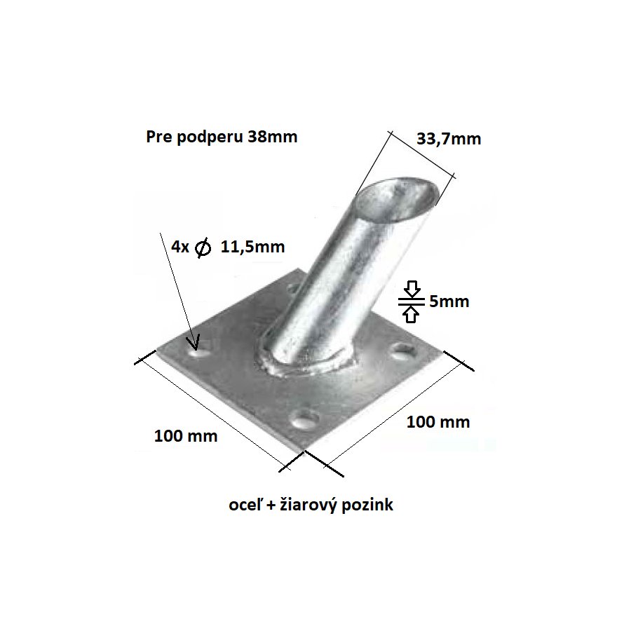 Pätka slúži na ukotvenie podpery k betónovej podlahe. Pätka úpravy zinok má platňu 10x10cm a je určená k podperám priemeru 38mm. Má 4 otvory pre kotvu do betónu. Kotvy "10mm" nie sú súčasťou balenia.
