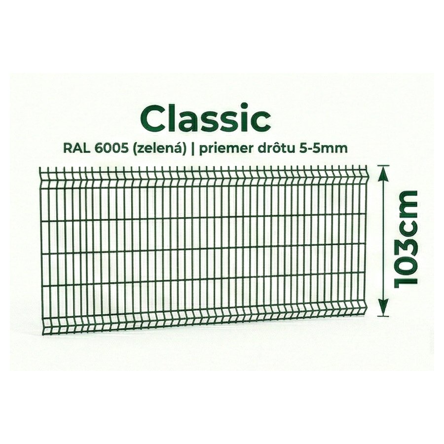 Plotový panel Classic 3D má rozmery 103 cm x 250 cm, drôt 5 mm a oko 45 x 200 mm. Je celo-pozinkovaný a poplastovaný v odtieni RAL 6005 pre dlhú životnosť.