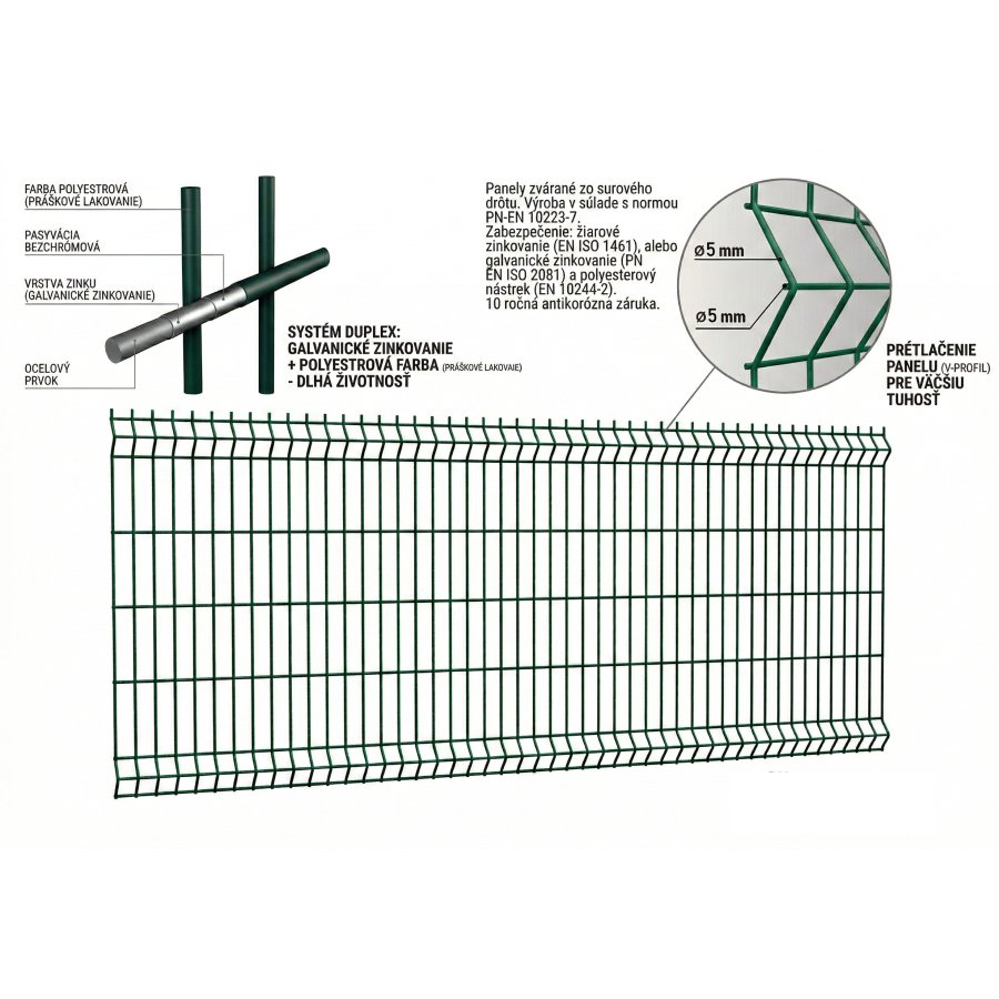 Tento panel je vyrobený s maximálnou starostlivosťou: najprv sa drôty zvaria do pevnej konštrukcie, potom sa celý panel pozinkuje a nakoniec dostane odolnú poplastovanú vrstvu v elegantnej zelenej farbe (RAL 6005). Na rozdiel od lacnejších alternatív, kde sa používa už pozinkovaný drôt a spoje po zváraní zostávajú zraniteľné voči hrdzi, Classic 3D je chránený naozaj dokonale – od kraja po kraj. Hrúbka drôtu 5 mm (oproti 4 mm u Apollo 3D) a veľkosť ôk 4,5 x 20 cm z neho robia pevnejší a odolnejší prvok vášho oplotenia.