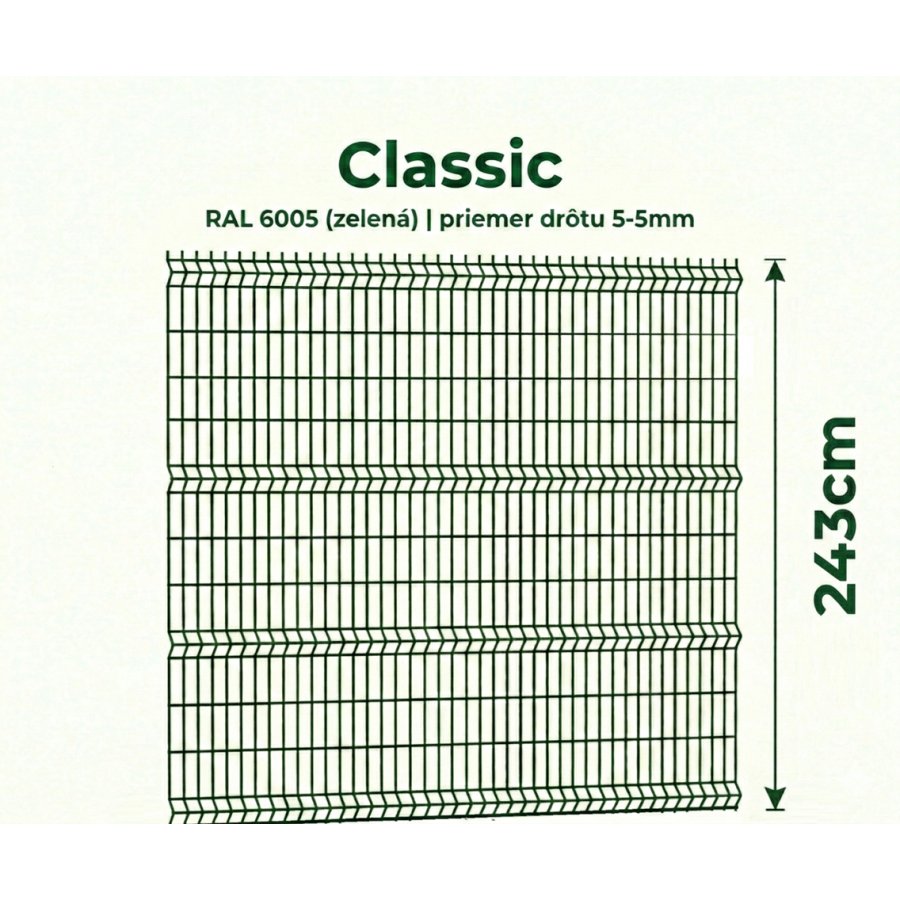 Plotový panel Classic 3D má rozmery 243cmx250cm, drôt 5mm a oko 45x200mm. Je celo-pozinkovaný a poplastovaný v odtieni RAL 6005 pre dlhú životnosť.